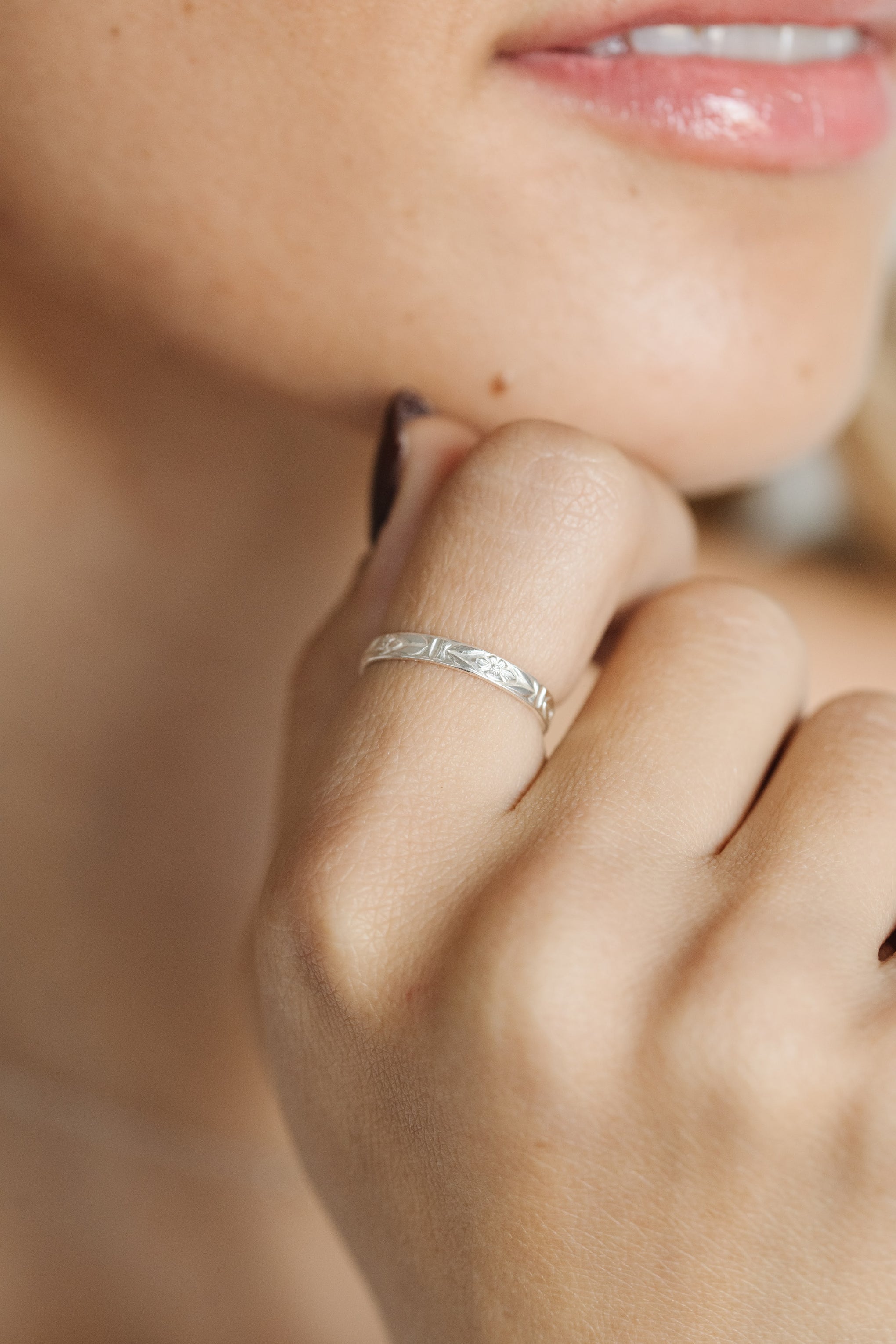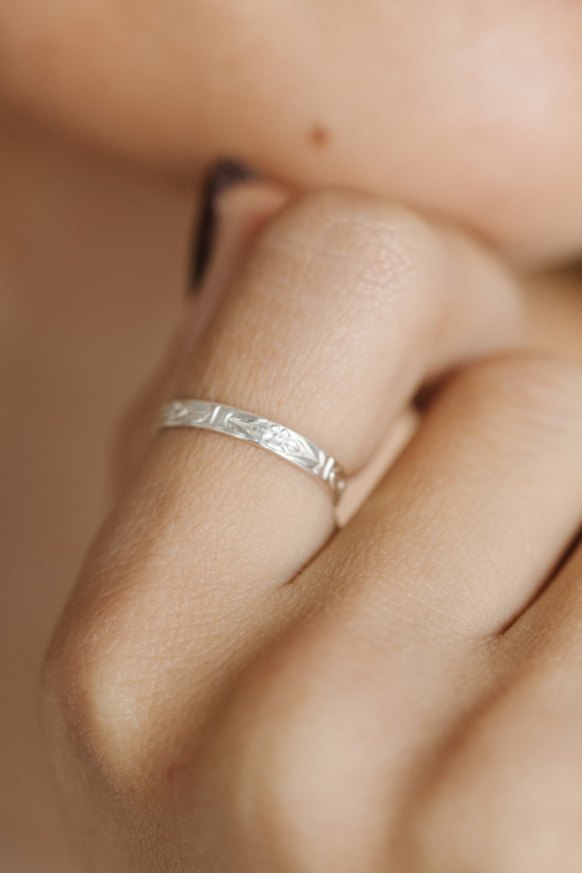 Delicate and charming, the Blair Ring features a flat band engraved with a subtle floral design, bringing a touch of nature’s beauty to your everyday look. Its lightweight, comfortable fit makes it perfect for stacking or wearing on its own as a statement of understated elegance. Crafted in sterling silver, this ring adds a soft, feminine touch to any outfit.