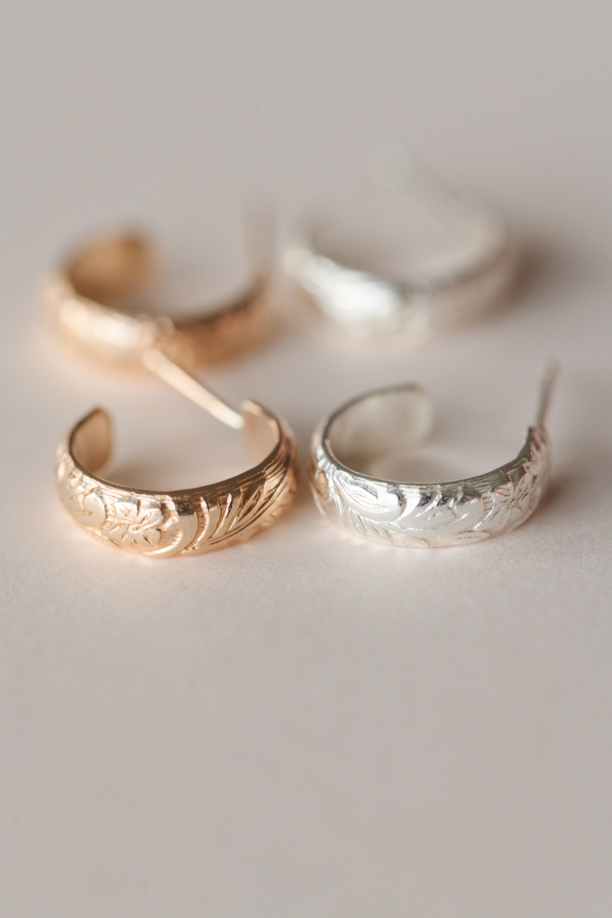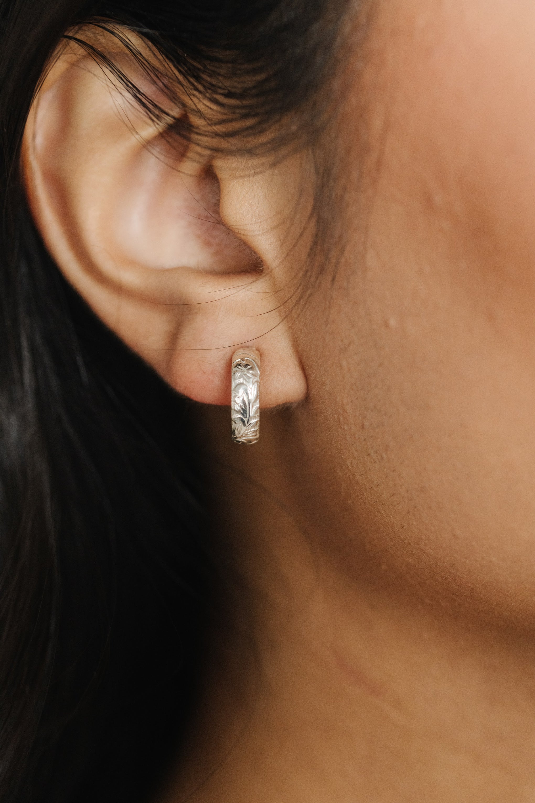 Charming and whimsical, these post hoops feature a subtle botanical pattern etched along the wire, adding a touch of nature-inspired detail to a classic hoop shape. Lightweight and easy to wear, they bring a playful elegance to any outfit and pair beautifully with both everyday looks and dressier styles.