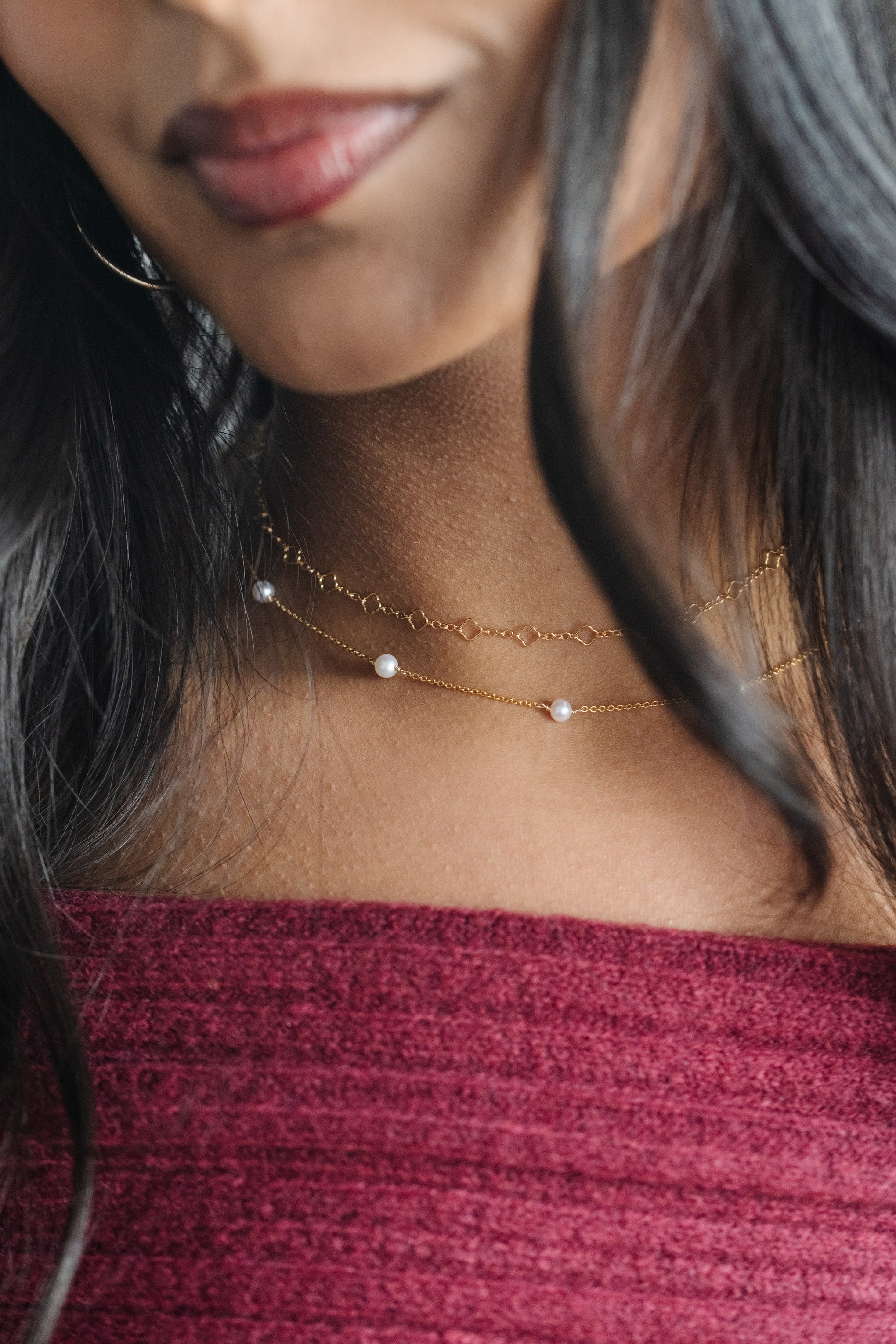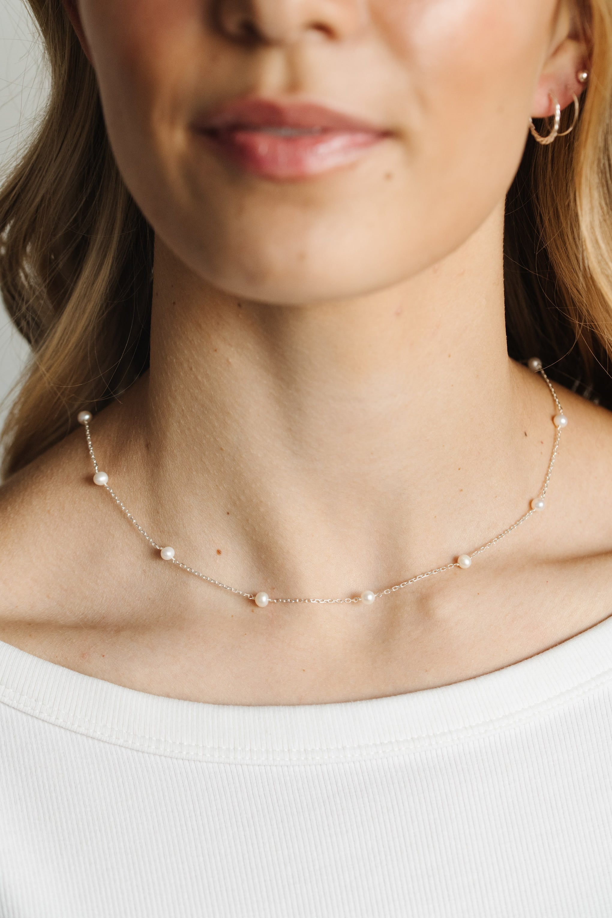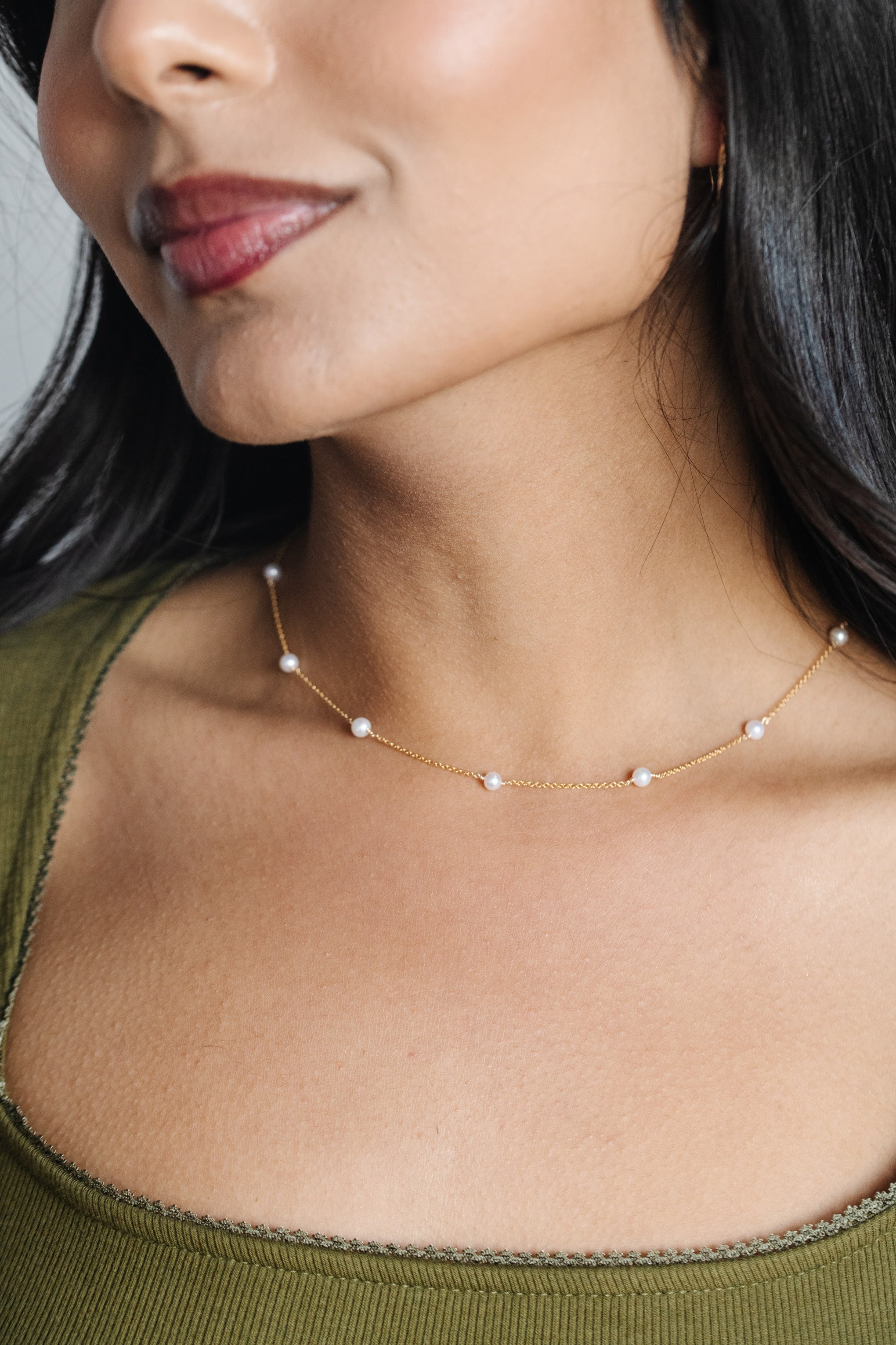 A fresh take on a timeless classic. This necklace features freshwater pearls spaced along a delicate chain, creating a look that’s both refined and effortlessly wearable.