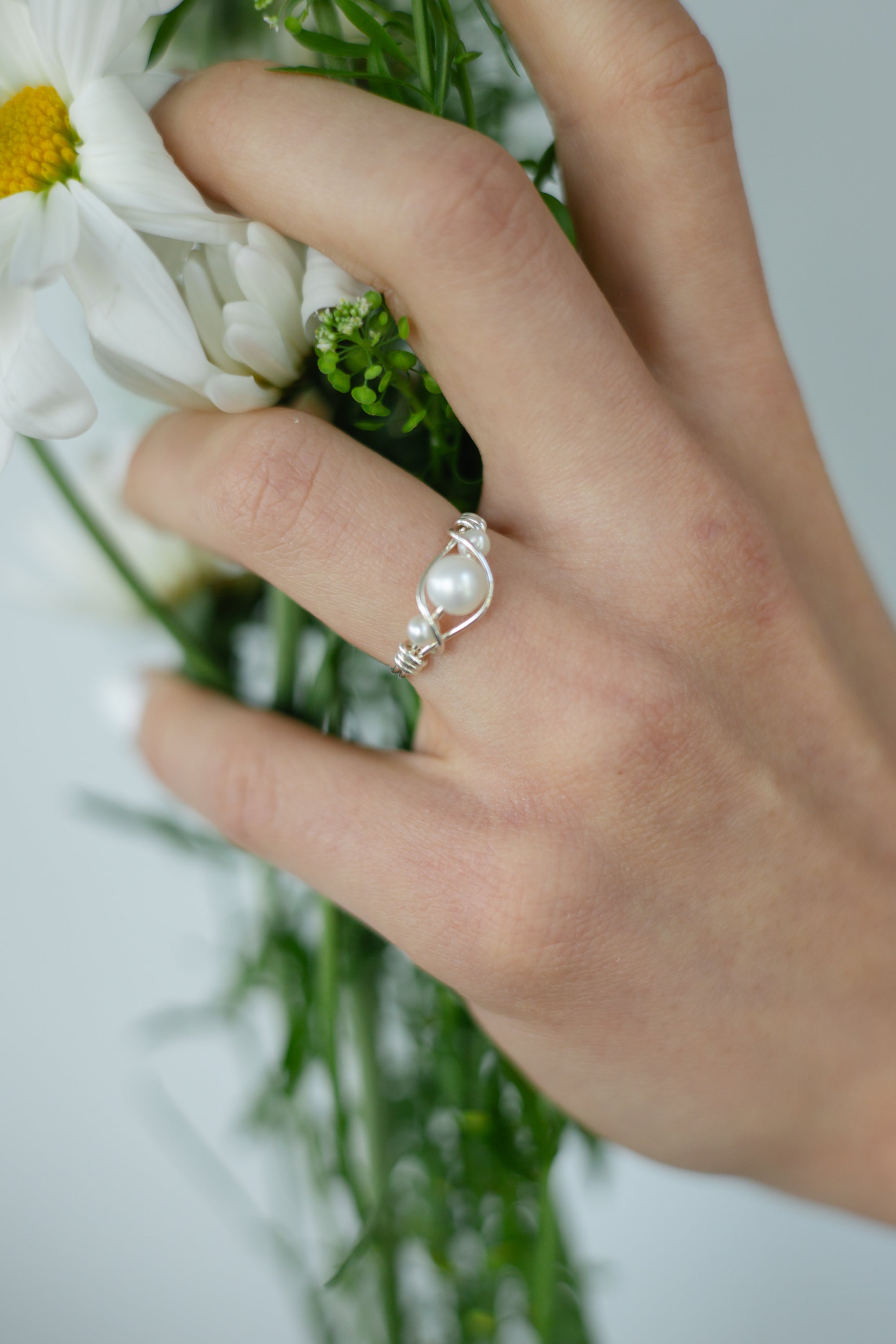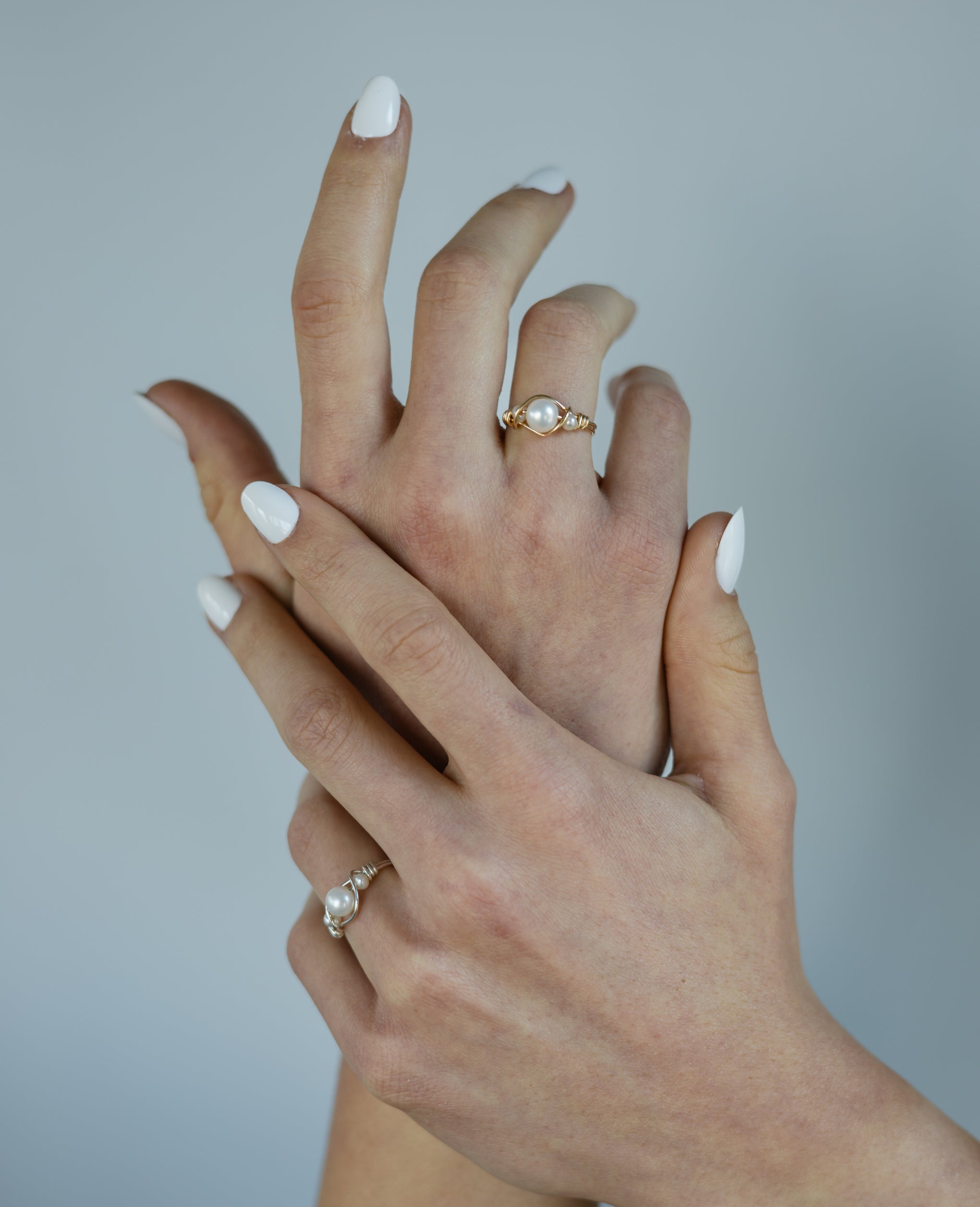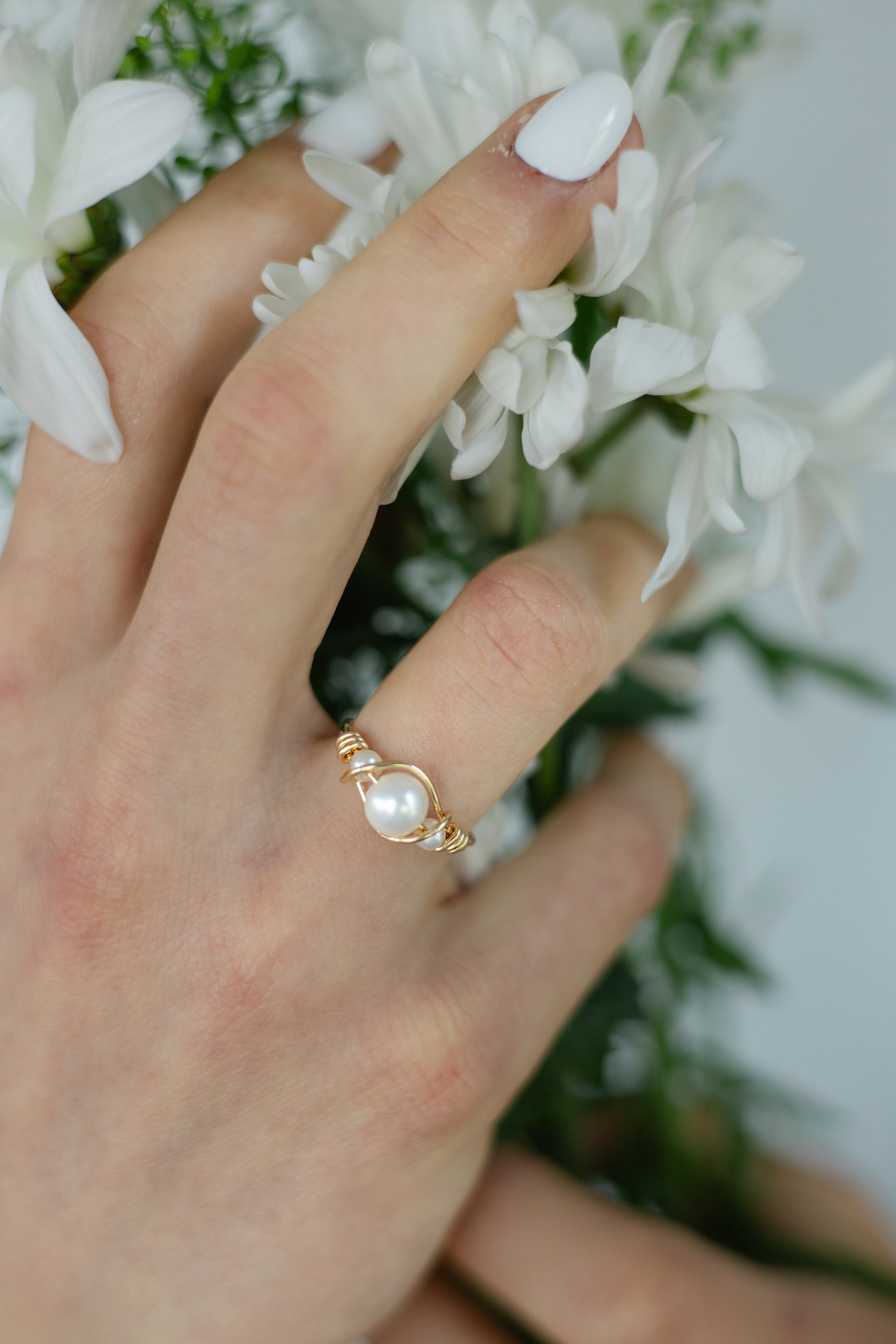 A large freshwater pearl sits at the center of this ring, gently wrapped in wire and flanked by two smaller pearls on each side. Timeless and feminine, this piece will be your new go-to!