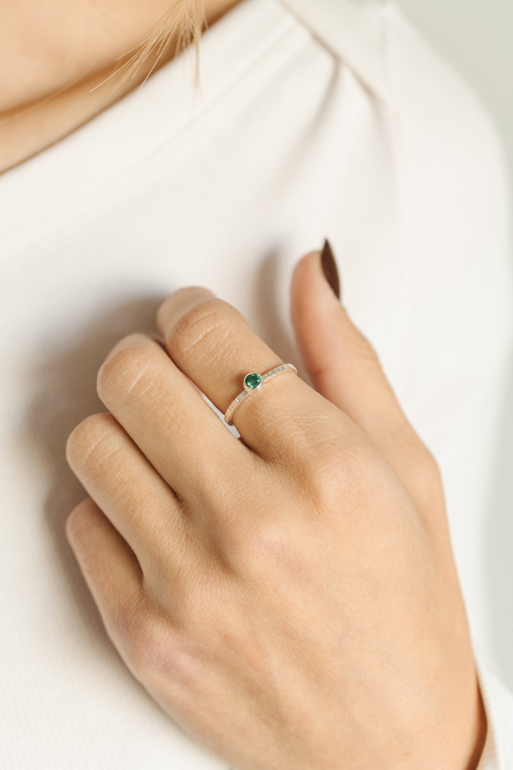 A little sparkle for the season, reimagined with subtle texture. The Holiday Sparkle Ring features either a single green or clear cubic zirconia set on a hand-hammered sterling silver band, giving it a unique, artisanal feel. Simple enough for everyday wear, yet special enough to celebrate the holidays, it’s a timeless piece that adds a festive touch to any look.